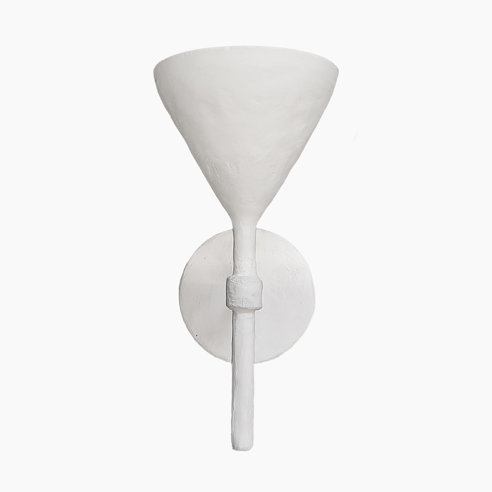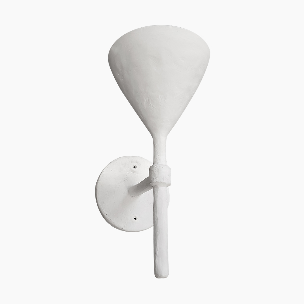 This sculptural wall sconce is inspired by the expressive surface language of Giacometti-style lighting, featuring a hand-applied plaster finish that creates subtle organic texture and depth. The conical shade gently diffuses light upward while the elongated stem adds a refined architectural presence. The matte white plaster surface highlights artisanal craftsmanship and gives the piece a timeless gallery-quality appearance suitable for luxury interiors.
